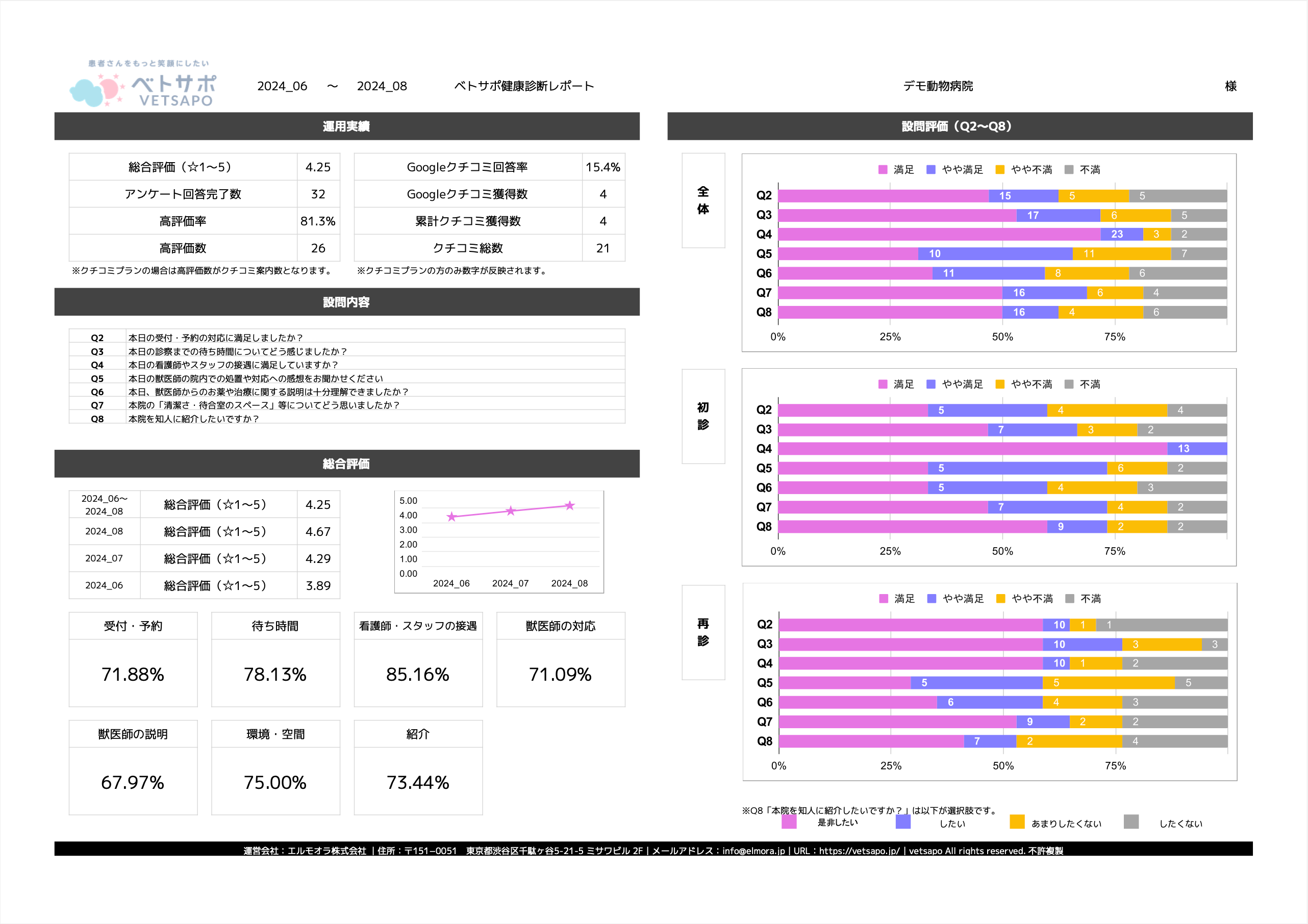 独自の設問で詳細な分析を行い、他院との比較も可能。自院の強みと改善点を明確に把握できます。
